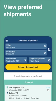 · View your preferred shipments that are based upon your lane preferences and available equipment postings. These can easily be added, edited, or removed on our app. Let the app do the work and we will notify you when shipments match your capacity!