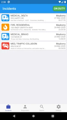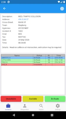 When a new incident is dispatched via CAD, it will show up nearly immediately in the app, and first responders can set their response (En Route, Available, Unavailable), along with response time and station. This allows fellow responders to quickly see who is responding to an incident and when they will be there.