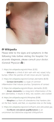 Artificial intelligence analyzes your submitted photographs and instantly searches for relevant medical documents about potential skin conditions. The algorithm provides documents on common skin disorders (e.g., warts, shingles), skin cancers (e.g., melanoma), and other skin rashes (e.g., hives). In the 2022 Stiftung Warentest, a German consumer organization, this application achieved satisfaction ratings only slightly below those of paid teledermatology services.