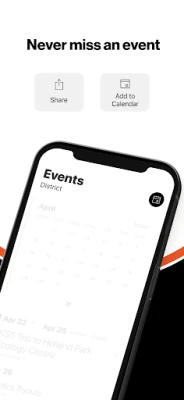 NEVER MISS AN EVENT The event section shows a list of events throughout the district. Users can add an event to their calendar to share the event with friends and family with one tap.